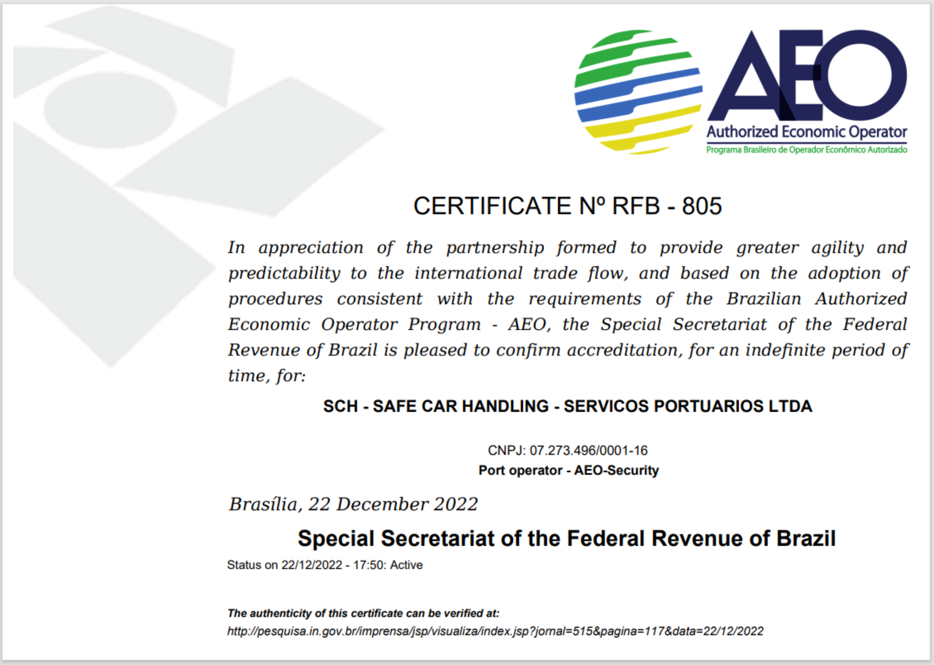 After certifying compliance with all requirements and criteria, being in Customs Compliance and Logistics Chain Security, he received from the Brazilian Federal Revenue Service (RFB) the Certificate of Authorized Economic Operator - OEA (Authorized Economic Operator - AEO) granted by the Brazilian government to foreign trade companies that present low risk.